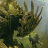 Description: a treant bends its head to let a human pet it
